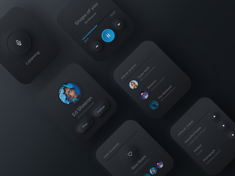 在此示例中,用于付款应用程序拆分的用户界面,Selim Firat结合了Neumorphism设计风格,从商标和应用程序徽标到所有不同的应用程序屏幕。请单击下面的链接以查看Behance上的完整项目,该项目在应用程序UI的各个UI组件中使用了柔和的阴影。