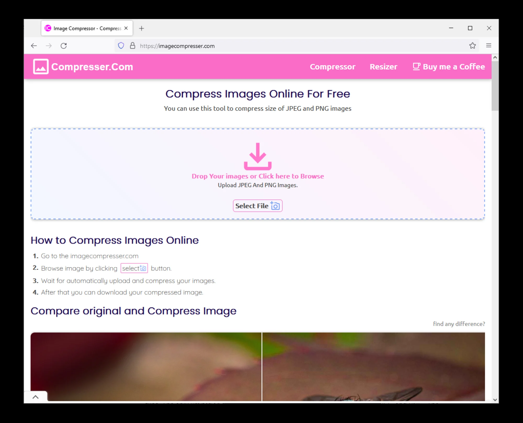 Imagecompresser.com允许您同时上传多达 10 个文件,并支持 PNG、JPEG、WebP、JPG 和 GIF 格式。每个图像的文件大小似乎没有任何限制,因此这可能适用于 10 个或更少的大文件。