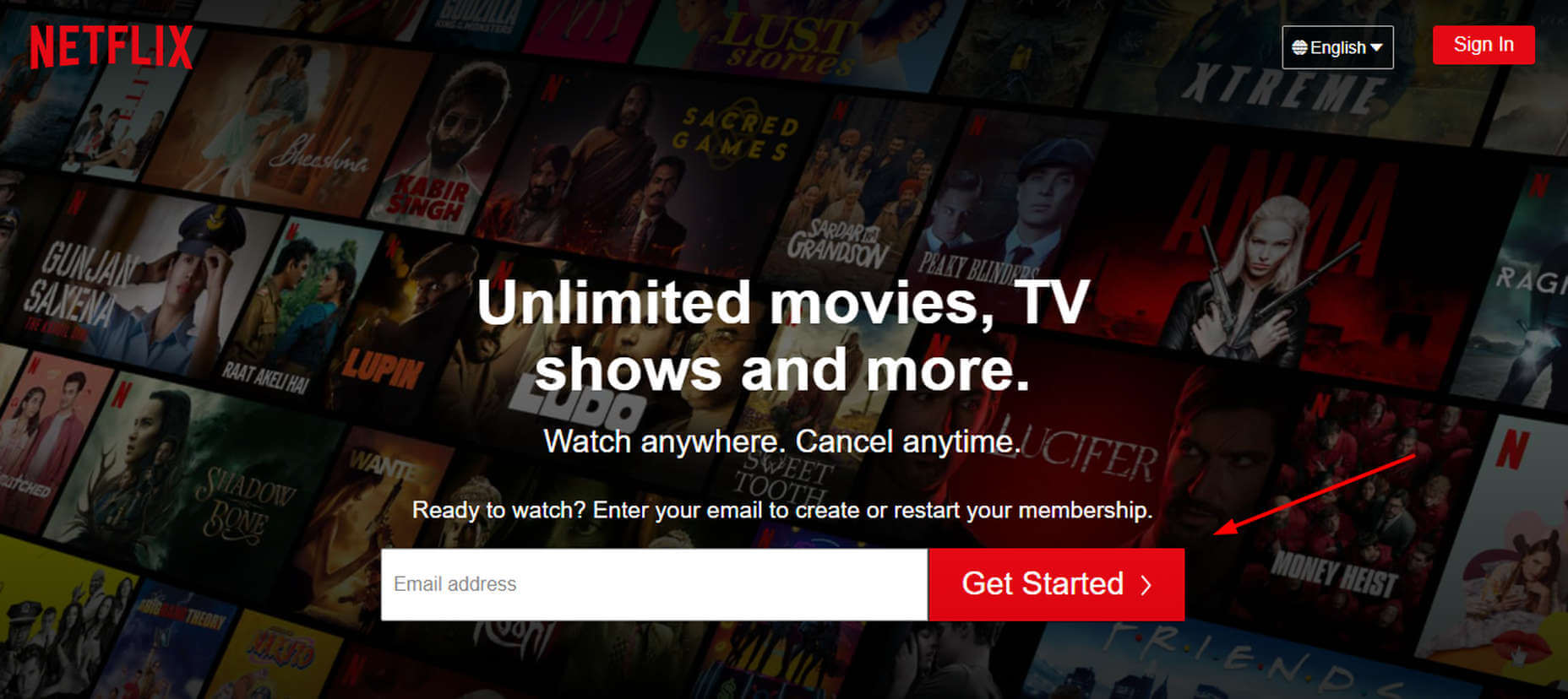大多数企业都会错误地添加 CTA 按钮,先说服用户点击它,然后询问访问者的电子邮件地址。Netflix 在 2019 年的设计中也做了同样的事情。然而,Netflix 在其 2021 年的主页设计中结合了这两个步骤。新的、改进的 2021 主页设计要求在前面提供用户电子邮件地址和 CTA 按钮。这是两种设计的很好比较:该设计鼓励访问者在登陆主页时立即输入他们的电子邮件地址。因此,当用户开始该过程时,表单提交会容易得多。因此,Netflix 通过减少摩擦,使访问者更容易沿着他们的转换渠道顺利移动。
